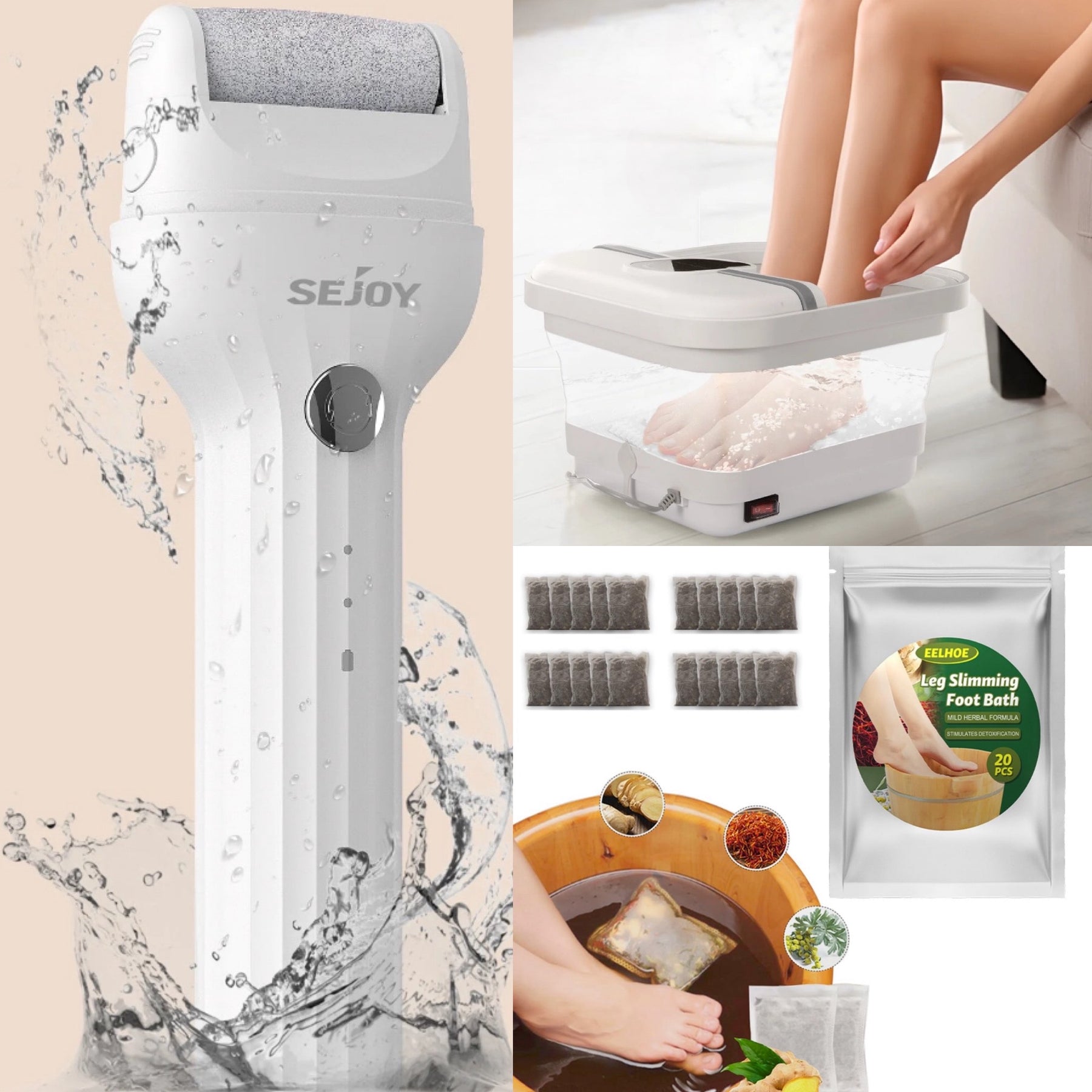 Pamper yourself with the rechargeable callus remover, featuring 3 interchangeable heads, and the collapsible foot massager with bubble functions. Complete your self-care routine with 20 all-natural foot detox bags for reducing swelling and easing muscle tension.